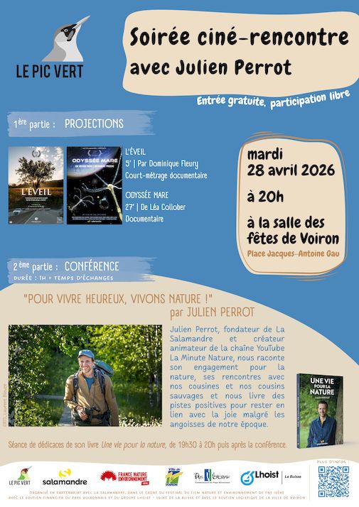 Le Pic Vert vous présentera deux films, qui seront suivis d’une conférence présentée par Julien PERROT, fondateur de La Salamandre et créateur animateur de la chaîne Youtube La Minute Nature.